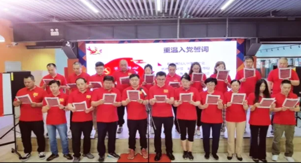 会后,是新党员入党宣誓及老党员重温入党誓词。在党群服务中心红色主题背景下,在领誓人刘泽君同志的带领下,全体党员紧握右拳,面向党旗庄严宣誓,铿锵有力的誓言响彻会场。